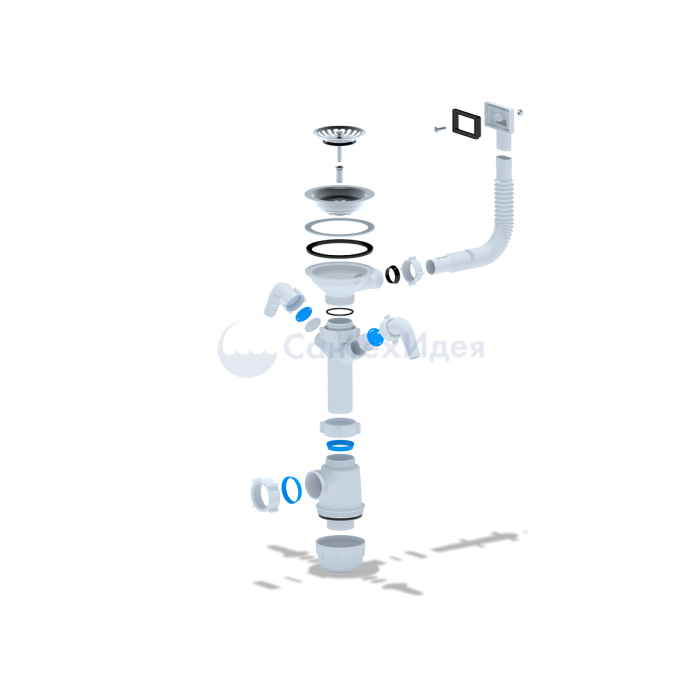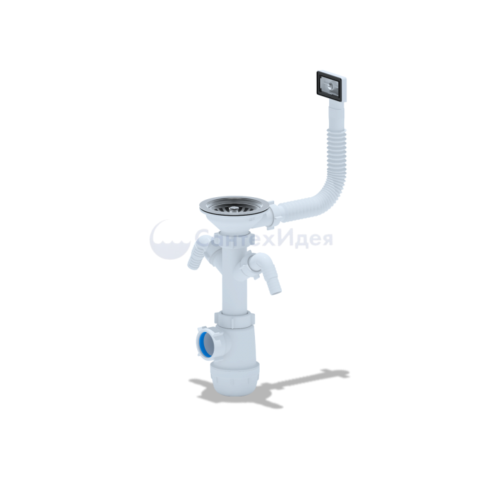 Сифон для кухонных моек с диаметром сливного отверстия 90мм, бутылочного типа с увеличенным корпусом. С разборным выпуском и нержавеющей решеткой, с гибким прямоугольным переливом для моек из нержа...
