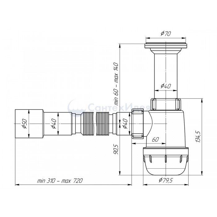 • Сифон сливной АНИ пласт А0515 для кухонных моек с диаметром сливного отверстия 50-60 мм, с литым выпуском