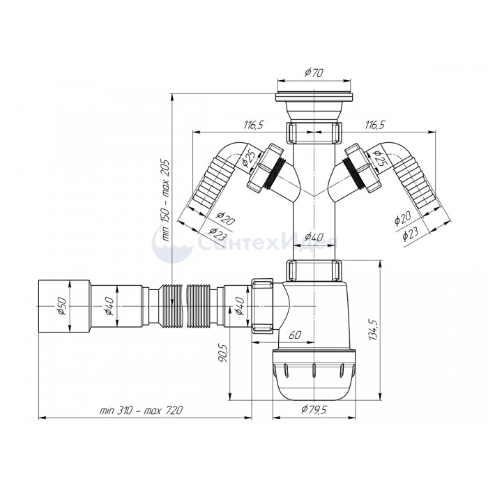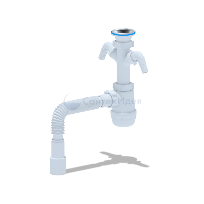 Сифон для кухонных моек с диаметром сливного отверстия 50мм, бутылочного типа с увеличенным корпусом. С разборным выпуском и нержавеющей решеткой , с двумя отводами для подключения бытовой техники....