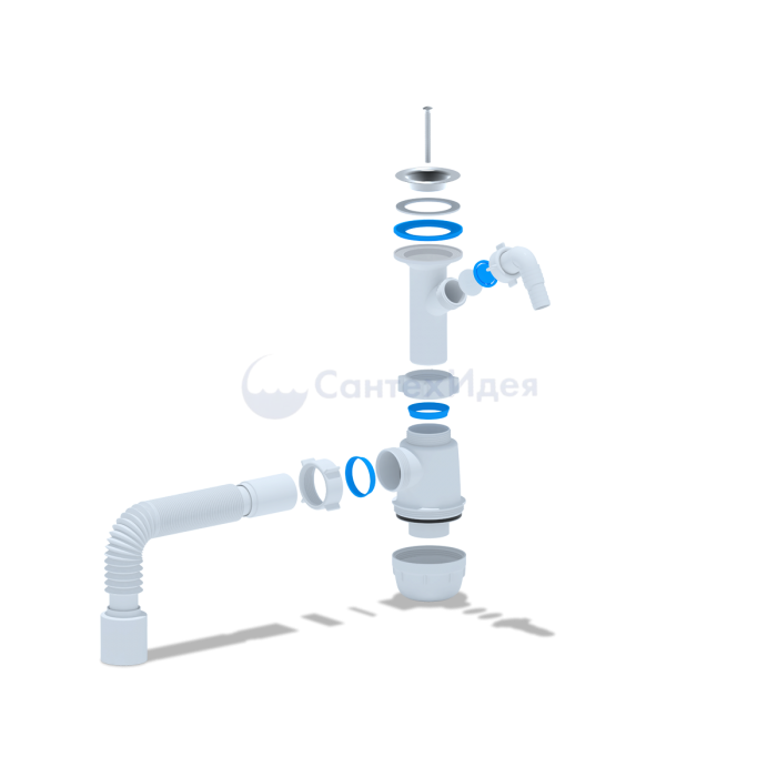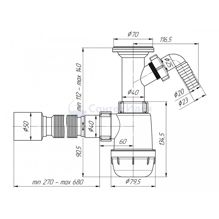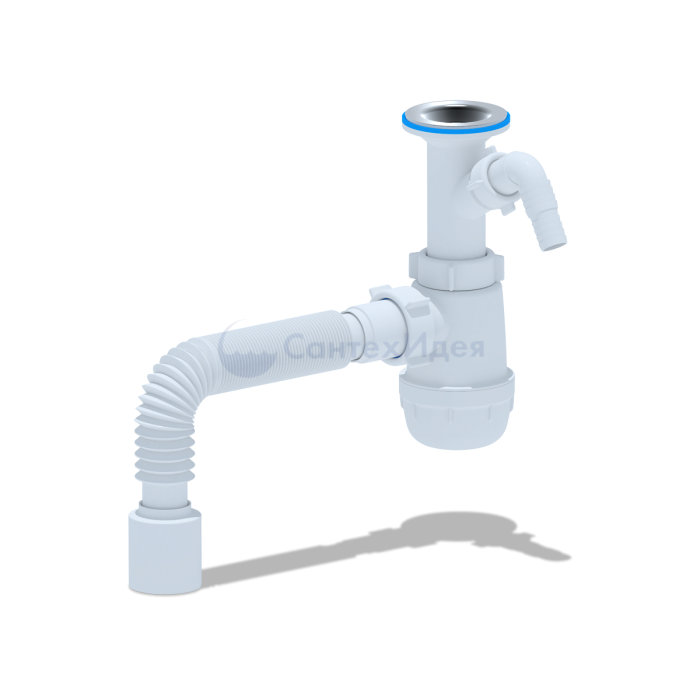 • Сифон сливной АНИ пласт А2010 для кухонных моек с диаметром сливного отверстия 50-60 мм, с литым выпуском и отводом для подключения бытовой техники