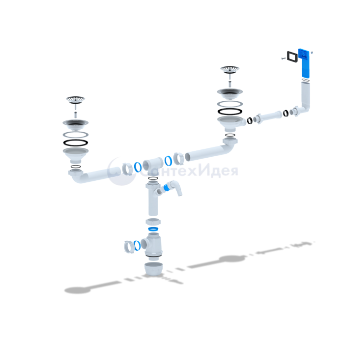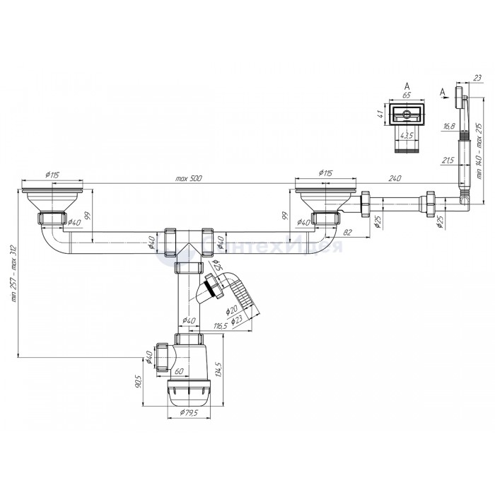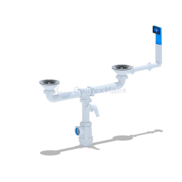 Сифон для кухонной мойки с двумя чашами и сливными отверстиями 90мм. Выход для подключения к канализации 40мм |