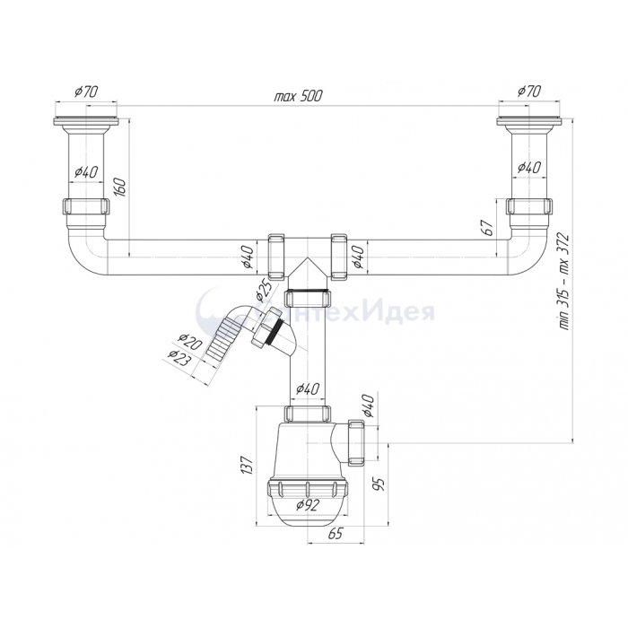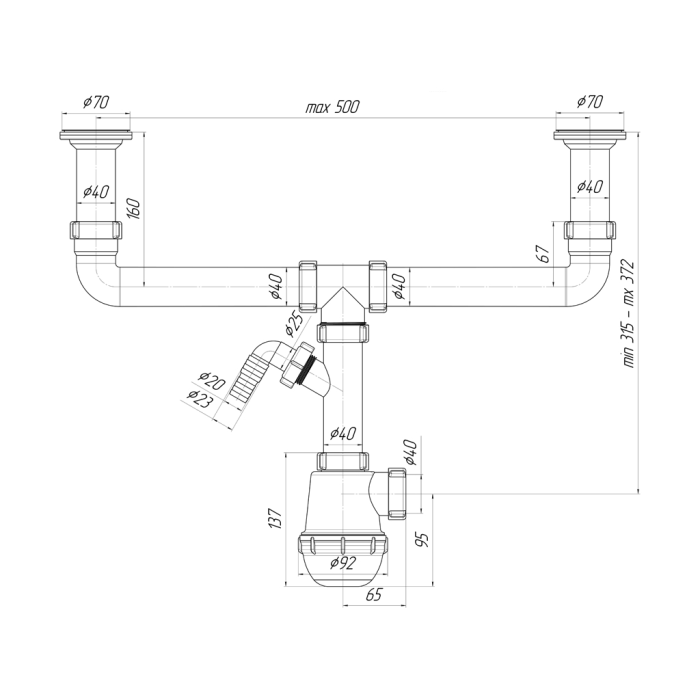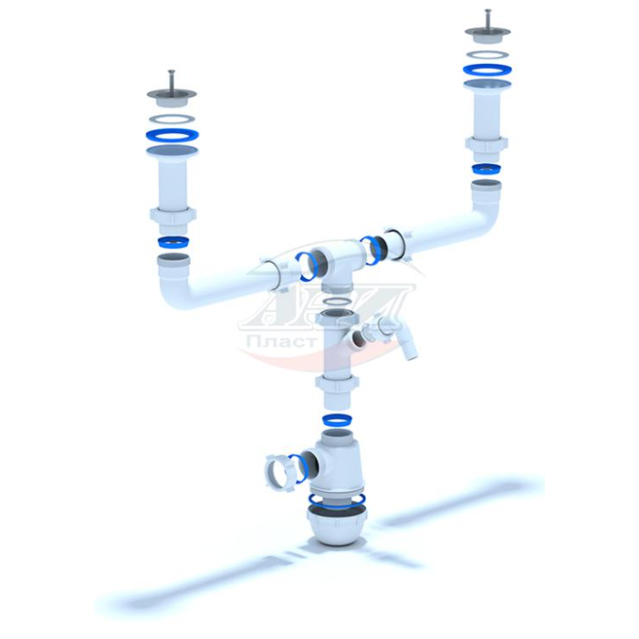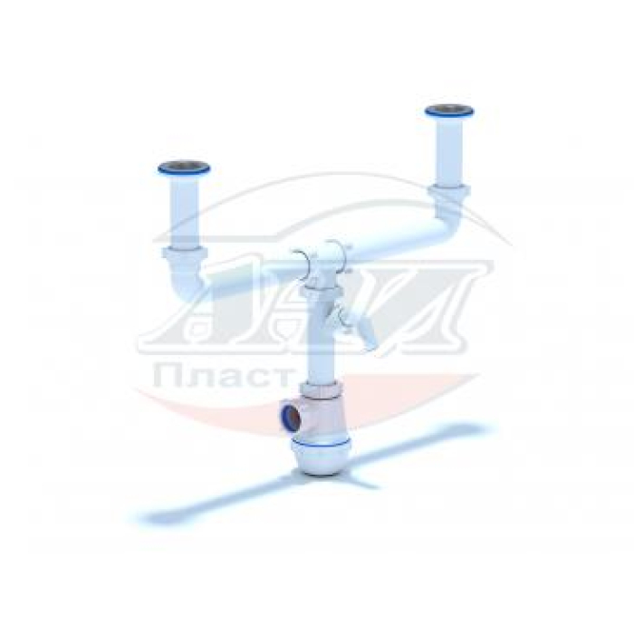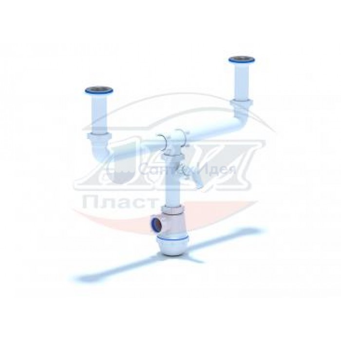 Сифон для кухонной мойки с двумя чашами разного уровня и сливными отверстиями 50мм. Выход для подключения к канализации 40мм