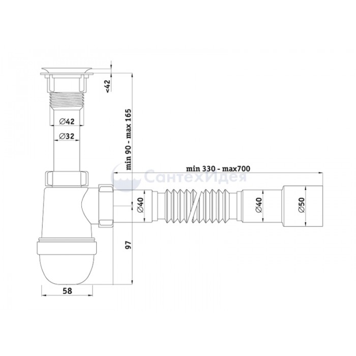 Габаритные размеры без трубы 255x94x73 Величина гидрозатвора 60 мм Материал горловины - полипропилен