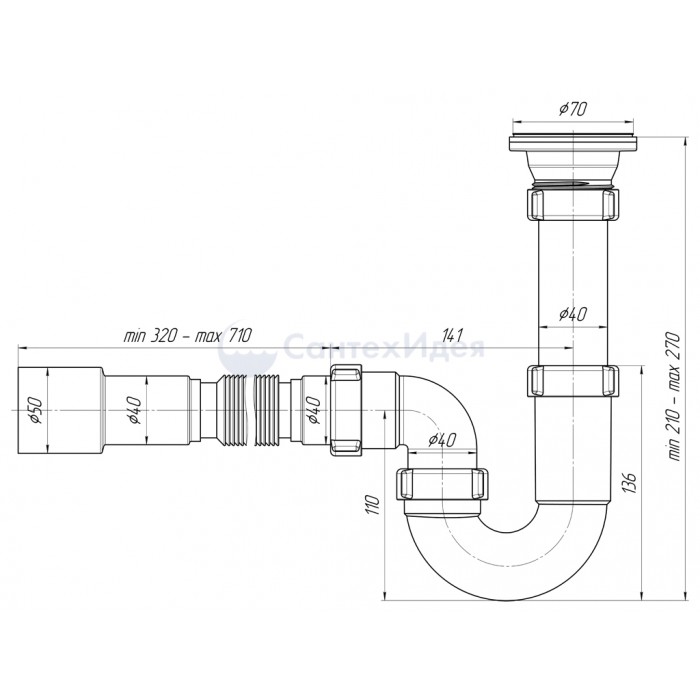 • Сифон сливной АНИ пласт D0115 для кухонных моек с диаметром сливного отверстия 50-60 мм