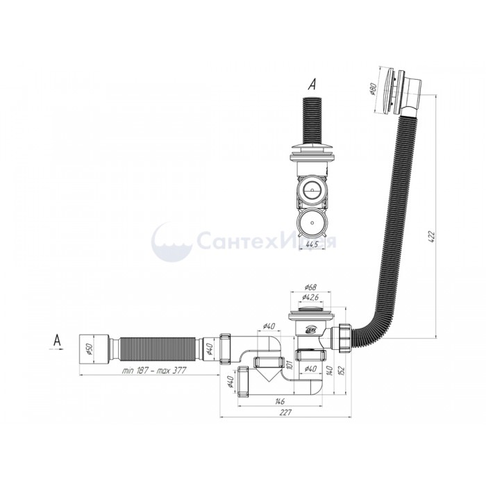 ЕС255S Сифон Ани д/ванны регулируемый с выпуском 1 1/2"*40 с переливом, клик-клак, с гибкой трубой 375*40/50 (сетка)