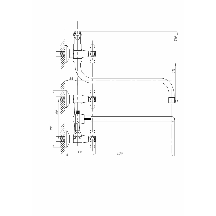 Смеситель, эксцентрики-2шт., декоративная шайба (отражатель)-2шт., шланг душевой, лейка душевая, держатель душевой лейки, паспорт.