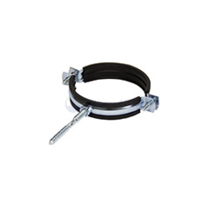Стальной оцинкованный хомут для крепления различных труб, имеет резиновый уплотнитель (виброгасящая прокладка) и резьбу под винт-шуруп.