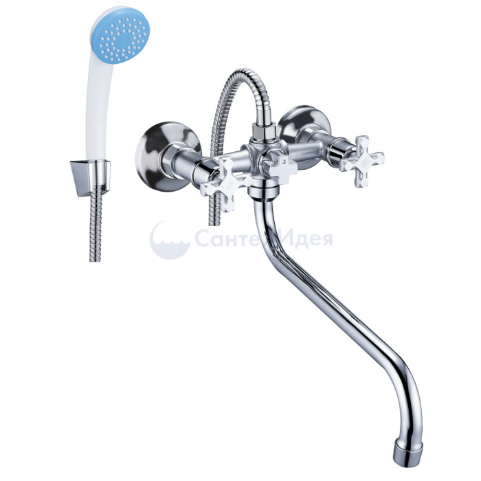 Смеситель имеет поворотный излив (длина 352,50 мм) на 360°, аэратор для экономии расхода воды, переключатель на корпусе, а также керамическую (1/2) кран-буксу с поворотом 90°. В комплекте: смеситель, душевая лейка (1 режим), держатель для лейки, шланг в металлической оплетке 120 см.