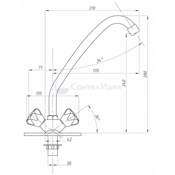 - Смеситель условно относят к типу елочка из-за схожей конструкции, которая заключается в расположении маховиков по равные стороны от излива под углом 45 градусов.