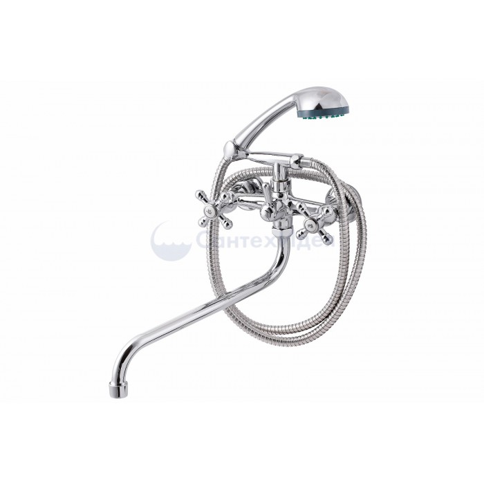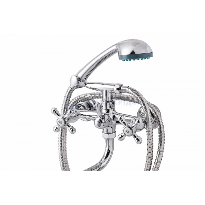 Смеситель, эксцентрики-2шт., декоративная шайба (отражатель)-2шт., шланг душевой, лейка душевая, держатель душевой лейки, паспорт.