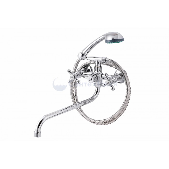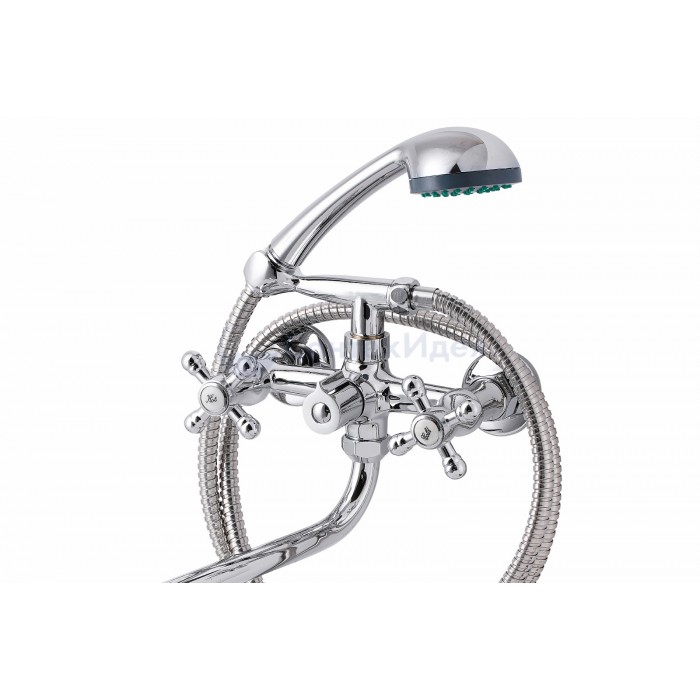 Смеситель, эксцентрики-2шт., декоративная шайба (отражатель)-2шт., шланг душевой, лейка душевая, держатель душевой лейки, паспорт.