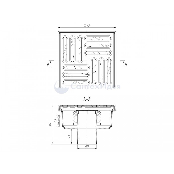 ТА5212 Трап вертик. н/р с вып. 50мм, с нерж. реш. 150*150