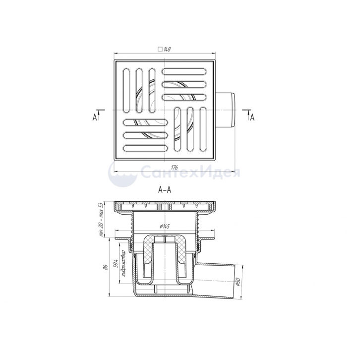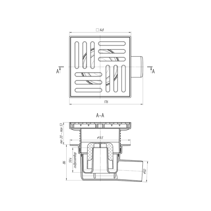 Трап с гидрозатвором регулировка по высоте от 20 до 53 мм. Рекомендуется при частом использовании, допустимая нагрузка до 150кг