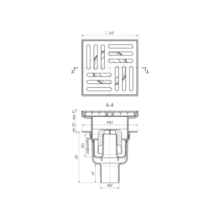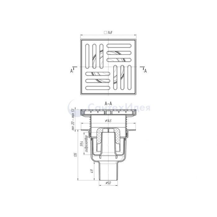ТА5710 Трап вертик. рег. с вып. 50мм, с пласт. реш. 150*150