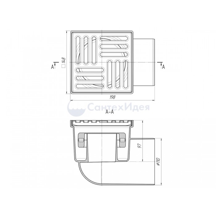 ТQ1112 Трап гориз. н/р с вып. 110мм, с нерж. реш. 150*150 сухой