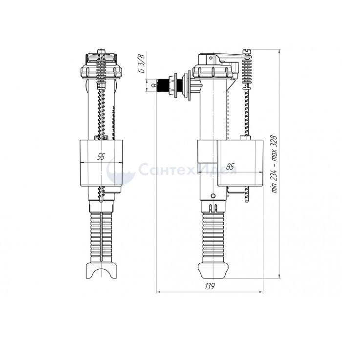 Наливной механизм бачка унитаза с боковой подводкой и пластиковой резьбой диаметром G 3/8 |