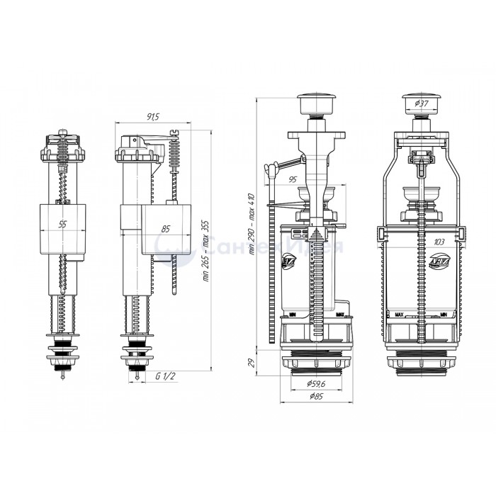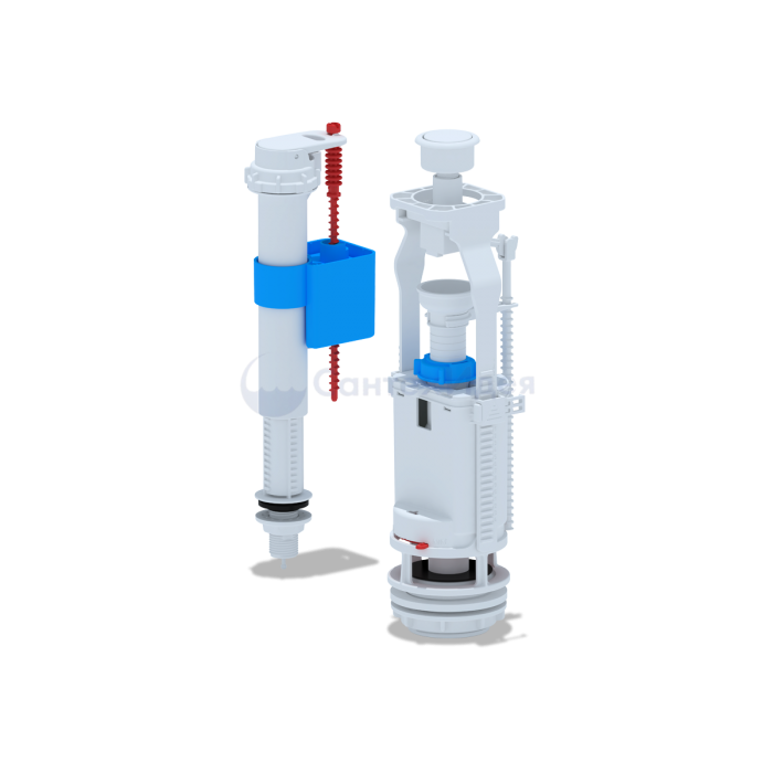 Набор для бачка унитаза. Наливной механизм с нижней подводкой и пластиковой резьбой диаметром G 1/2. Сливной механизм белая кнопка с одним режимом слива |
