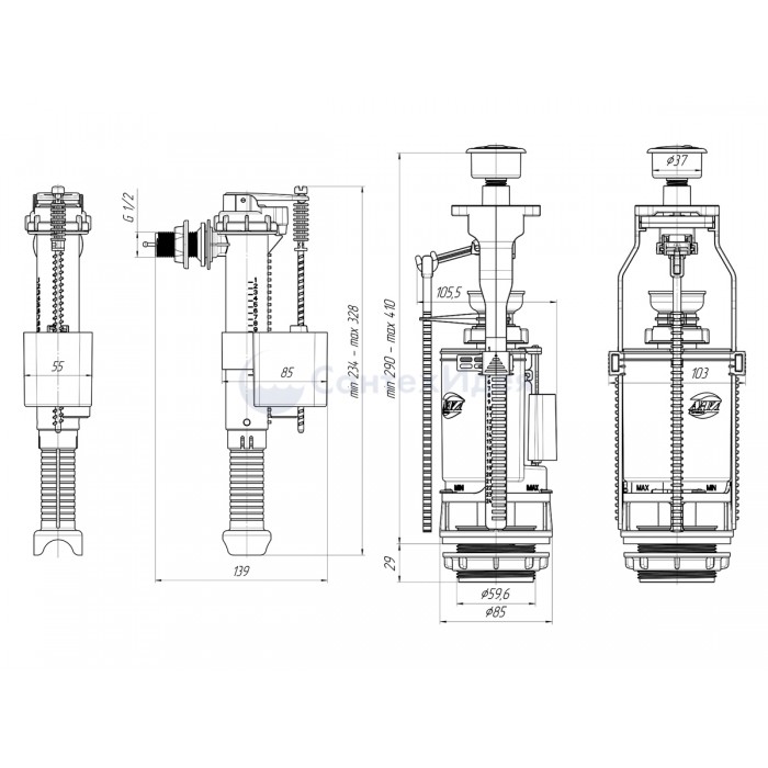 Набор для бачка унитаза АНИ пласт WC9010C. Наливной механизм с верхней боковой подводкой и пластиковой резьбой диаметром 1/2"", регулировка по высоте 234-328 мм.