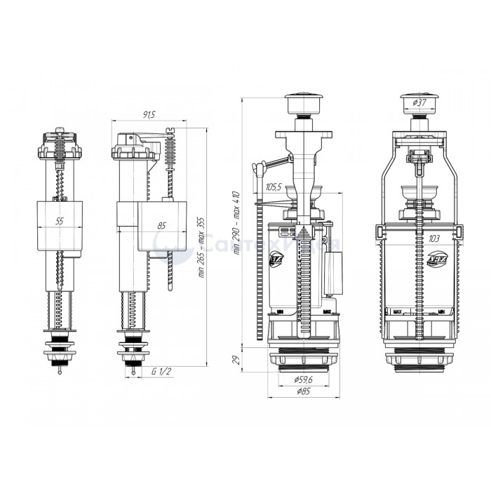 Набор для бачка унитаза АНИ пласт WC9510C. Наливной механизм с нижней подводкой и пластиковой резьбой диаметром 1/2"", регулировка по высоте 265-355 мм (стойка механизма поворачивается, устанавлива...